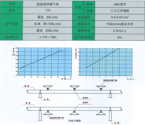 圓盤攪拌曝氣器外彩設計成傘齒型空氣分流,采用了ABS工程塑料為主體,同時設計雙層橡膠片止回裝置,確保污水不會進入支氣管道,這樣可以避免支氣管管道堵塞,這項技術革新使其長期運行中免去維修和更換的后果之憂,是跨世紀的新一代優秀產品。